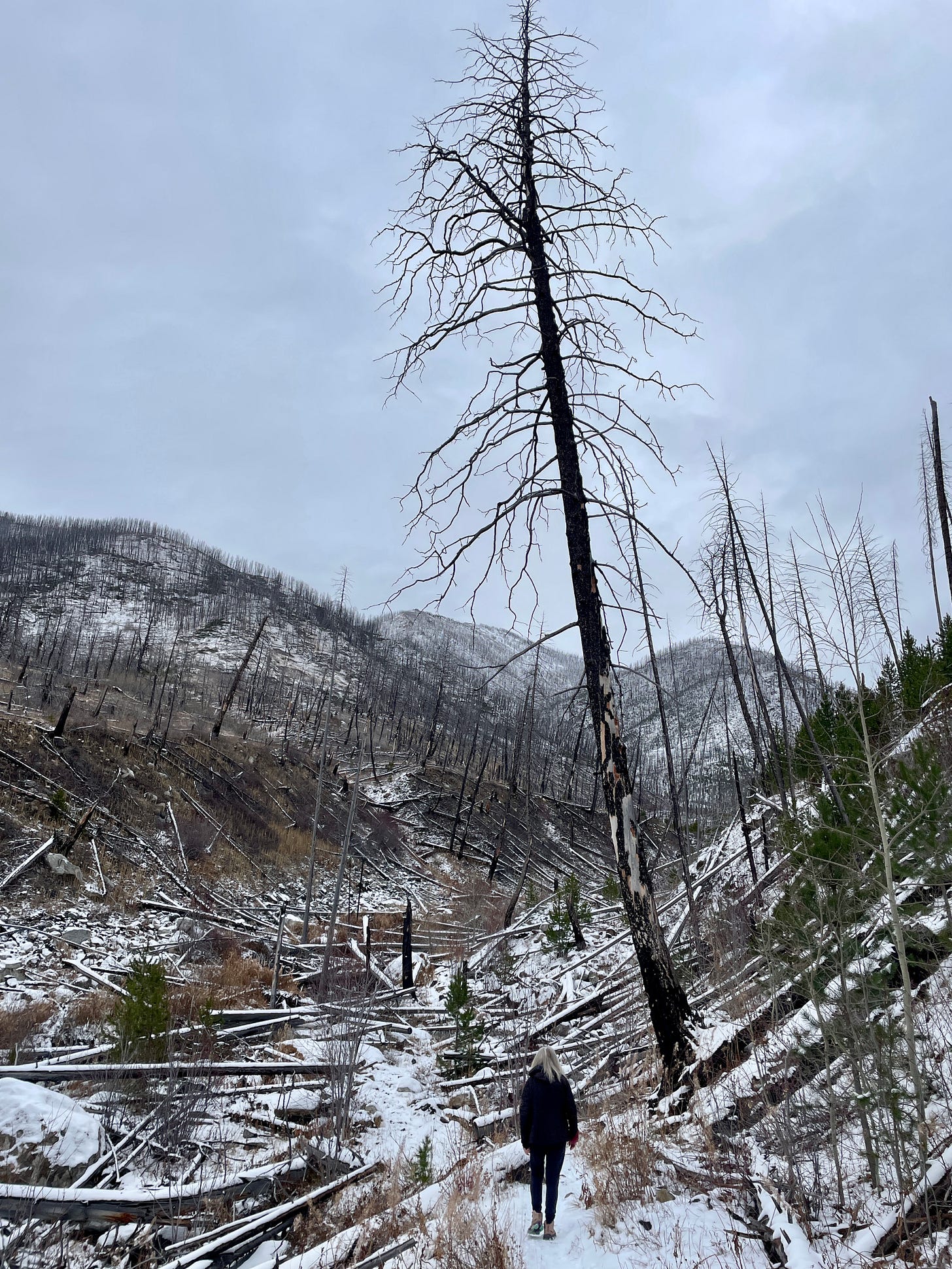 Early in the hike, my first thoughts were focused on the obvious destruction. But ever so slowly, I began to spot signs of recovery here and there. Young pines, five feet tall, some still dusted with that recent snow, were slowly growing back in the soil that the intense fire had made repellent rather than nurturing. The higher we climbed, the more living conifers intermingled with their fallen ancestors. At one point, there were ten-foot-tall pines on either side of the trail, making us feel, just for a few moments, that we had left the barren burn and entered a fledgling forest.