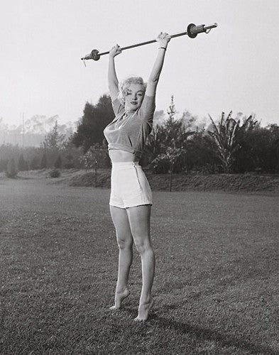 I kind of hate one-size-fits all prescriptions for exercise, especially the ones that stipulate minutes and reps. If all you take from this post is renewed interest in resistance training, a plan to talk to your doctor about what they think is safe for you to start, a renewed commitment to weights plus cardio, a fascination with muscle as more than just muscle, and an indelible photo of Marilyn Monroe — then it will have been worth the effort it took to share this with you.